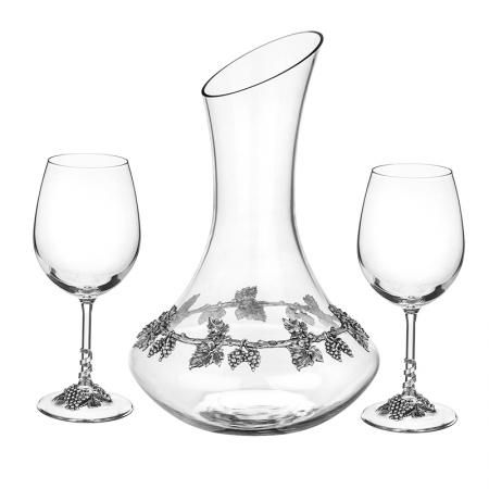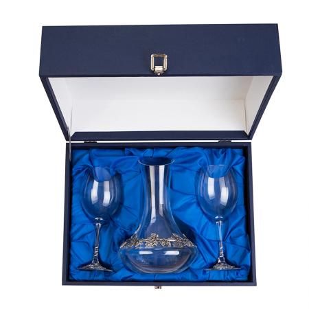 Изящна декорация от сплав от калай и сребро във формата на грозд с листа върху чашите и на лоза под формата на венец около съда за вино. Комплектът се предлага в луксозна синя дървена кутия, облицована отвътре със сатен.