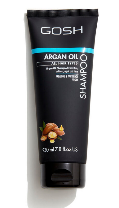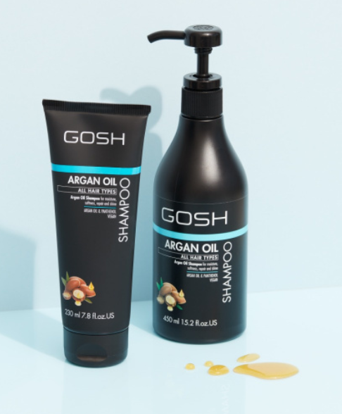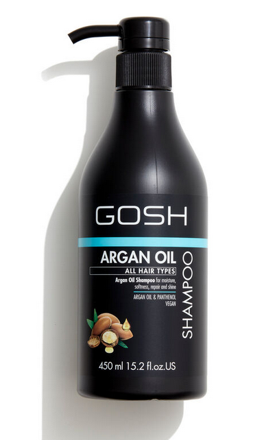 Шампоанът с арганово масло Gosh не само перфектно почиства косата, но също така интензивно възстановява цялата дължина и стимулира активността на космените фоликули.