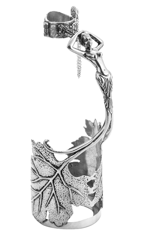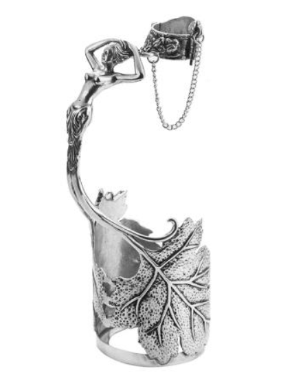 Ефектна метална стойка за бутилка вино, изработена от сплав от калай и сребро.