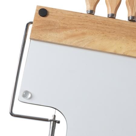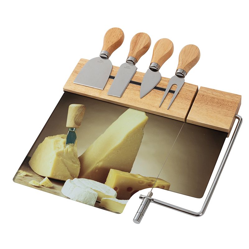 Комплектът включва: нож за пармезан, нож за твърди сирена, нож за меки сирена, вилица за сирене, подложка за рязане, изработена от темперирано/закалено/ стъкло, което го прави безопасно за употреба. За удобство приборите се поставят върху дървена поставка с магнитен държач .Комплектът съдържа и метална корда, подходящ за рязане на меки сирена.