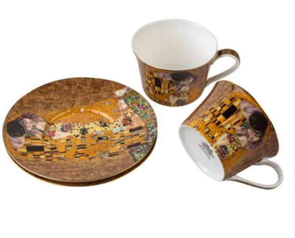 Луксозен комплект от фин костен порцелан с английски дизайн – съчетание от две чаши с две чинийки към тях , изработен по мотивите на популярната картина на Густав Климт –„Целувката“. Подходящ за всеки изискан и претенциозен вкус. Продуктите на Lancaster са отличен избор за всеки, който държи кухнята, дневната или трапезарията да притежават артистична атмосфера. Цената включва луксозна подаръчна кутия с размери - 24 см. дължина; ширина 19, 5 см. ; височина 9,5 см. Размери : Чаша: Ø 9,5 см. ; Височина: 6 см. ; Вместимост: 150 мл. ; Чиния: Ø 16 см. Стилен подарък за всеки повод, който носи в себе си уют и топлина.