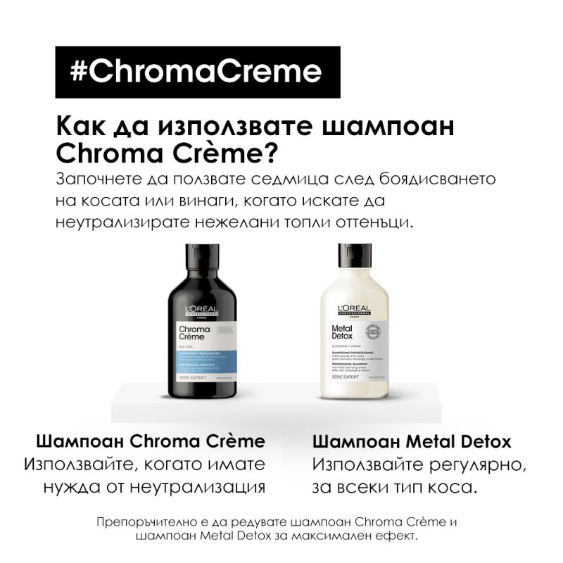 Препоръчваме използването на Chroma Crème, когато имате нужда от неутрализация. Използвайте Metal Detox регулярно, за всеки тип коса. Редувайте шампоан Chroma Crème и шампоан Metal Detox за максимален ефект.