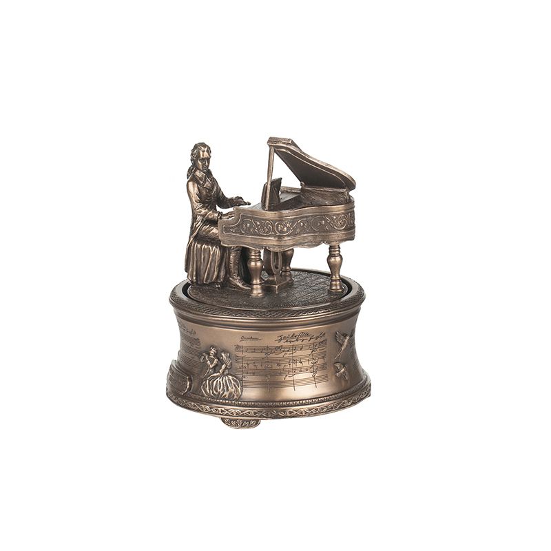 Статуетката е изработена прецизно от полирезин с покритие от метал и с внимание към всеки детайл, със самонавиващ се музикален механизъм, изпълнява фрагмент от Вълшебната флейта.