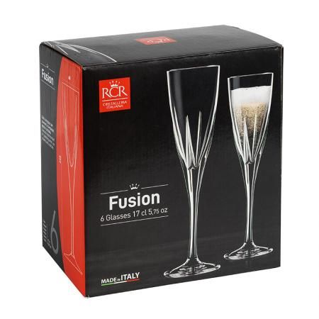 Чаши: Ø 6,8 см. Височина: 23,5 см. Вместимост: 170 мл. Стилен сервиз от 6 чаши за шампанско, произведени от италианската фирма RCR Crystal. Чашите създават усещане за наслада от вкуса на шампанското, с изящен дизайн и нестандартна форма. Подходящи за почистване в съдомиялна машина. Подарете си финес и красота на масата с италианско качество.