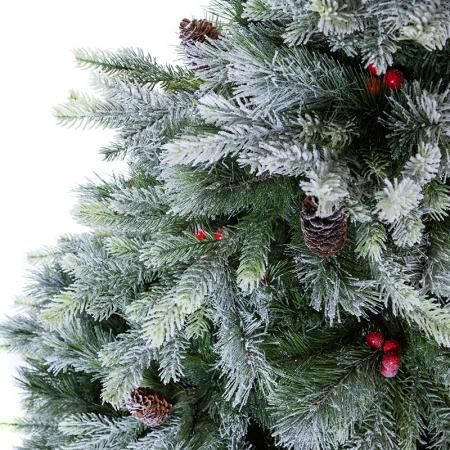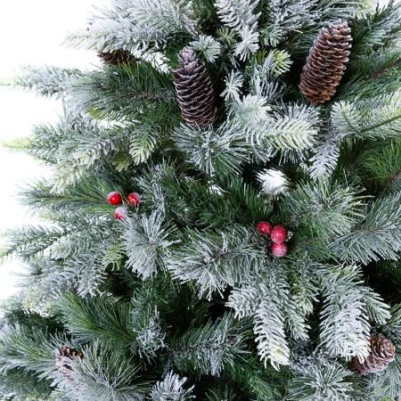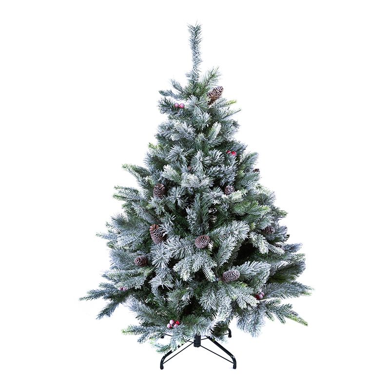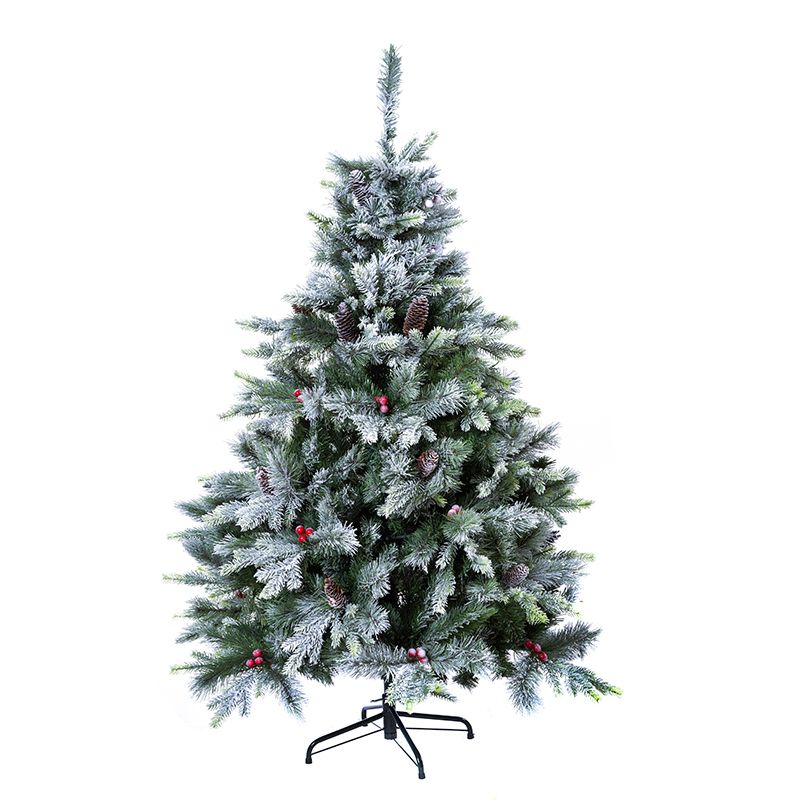 Изкуствена снежна елха с шишарки и червени плодчета. Размер 120 и 150 см.